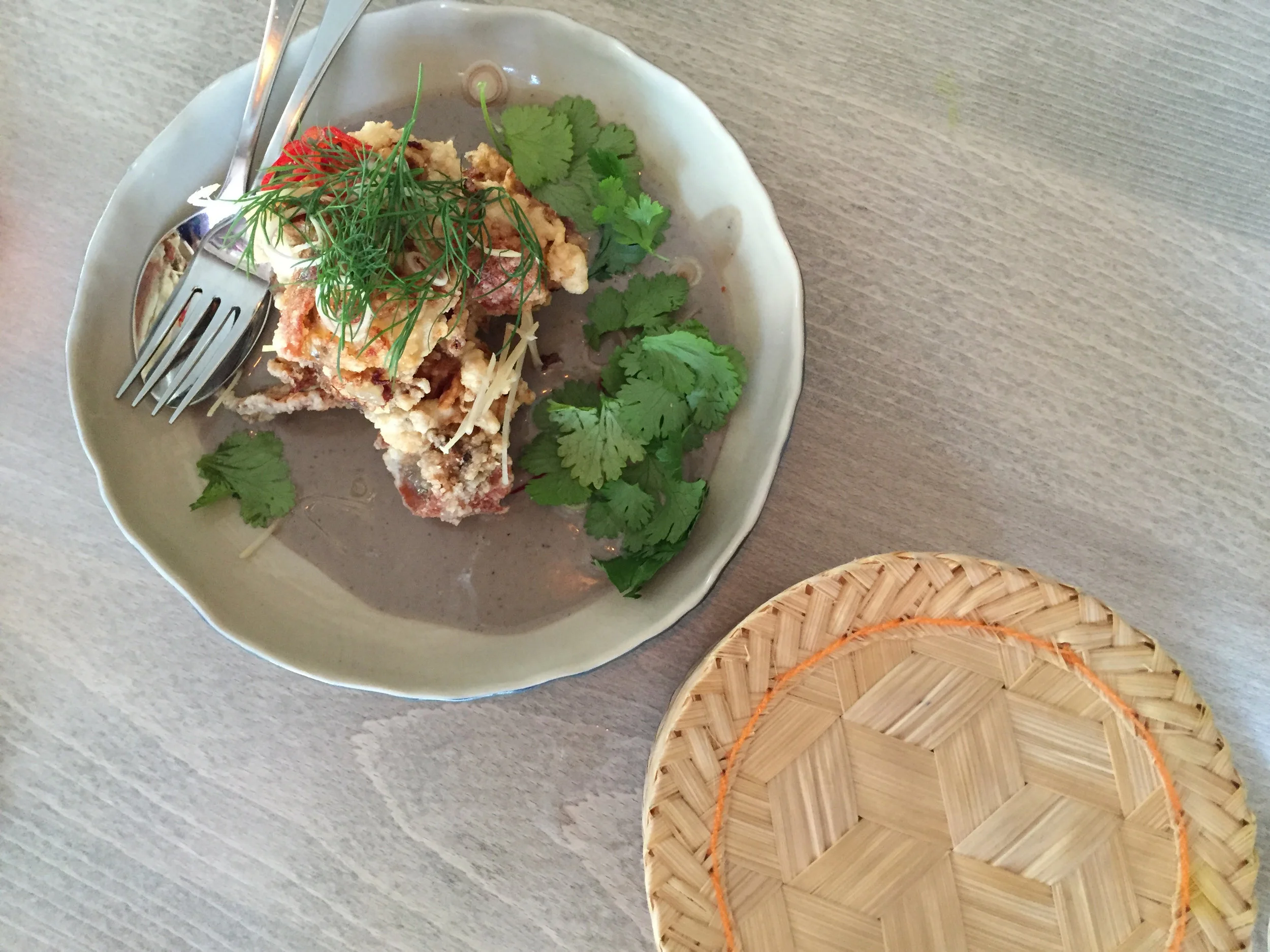 Luckily Tizzy and I were on a similar wave length that evening which made ordering (an otherwise difficult task once you see their menu) easy. We thought we’d start the ball rolling with chargrilled wild boar (!,) coconut and curry paste with peanut sauce and cucumber pickle, although dishes came out in a wonky sort of order, our skewers arriving last when we’d mostly satiated ourselves on everything else leaving little patience for fiddling about with chewy meat on a stick. My only experience with wild boars would be swiping left on the numerous dead specimens being carried around on the backs of Marlborough men, but I think I’d swipe left on them again if given the opportunity. Any gamey flavour that could be had seemed lost in the tidal wave of peanut sauce that engulfed the skewers. It was satay, by any other name. The grilled banana leaf parcel of market fish with lesser galangal and Thai herbs also came at the end and seemed to be white noise in our mouths following more intensely flavoured dishes.