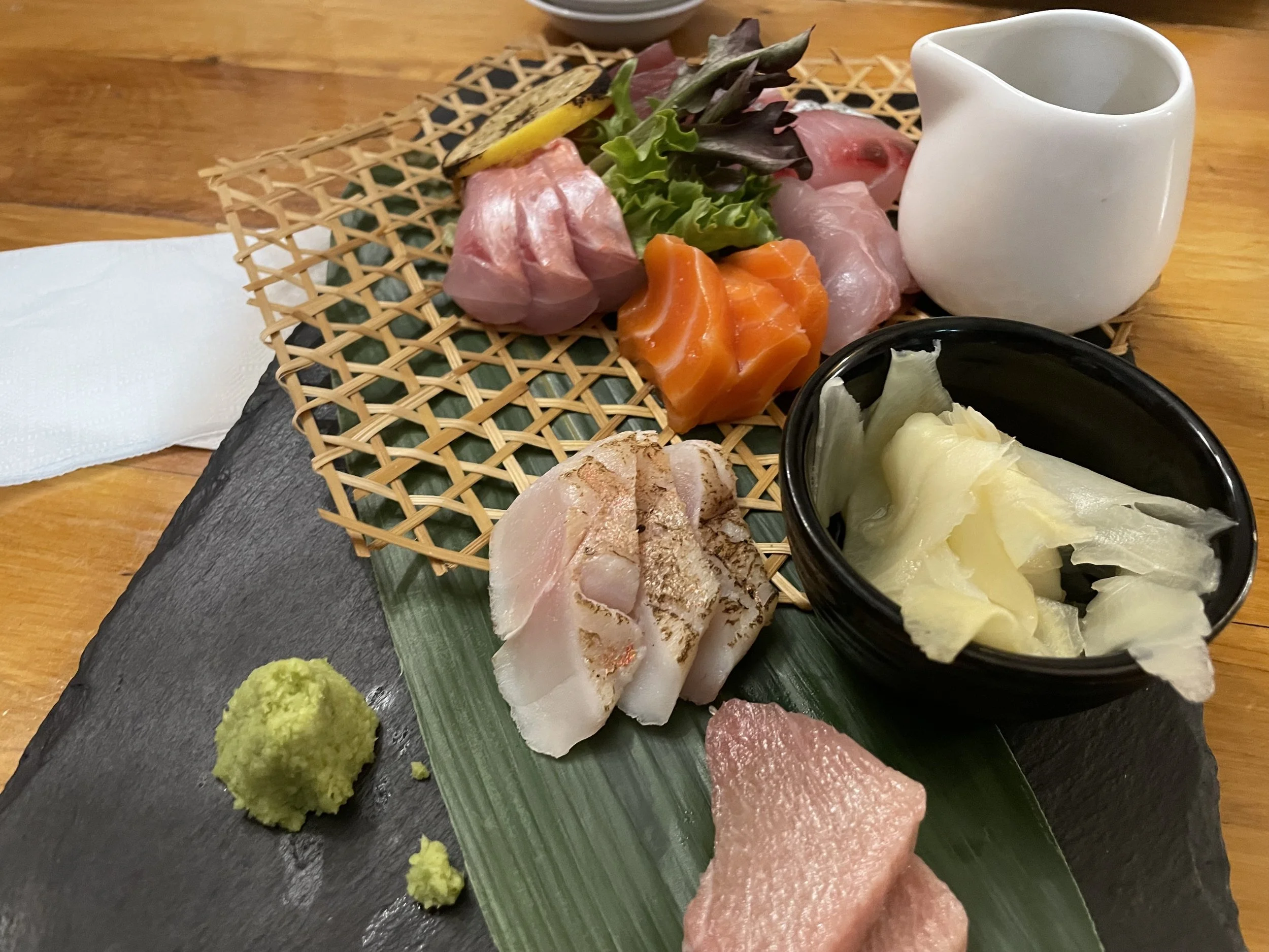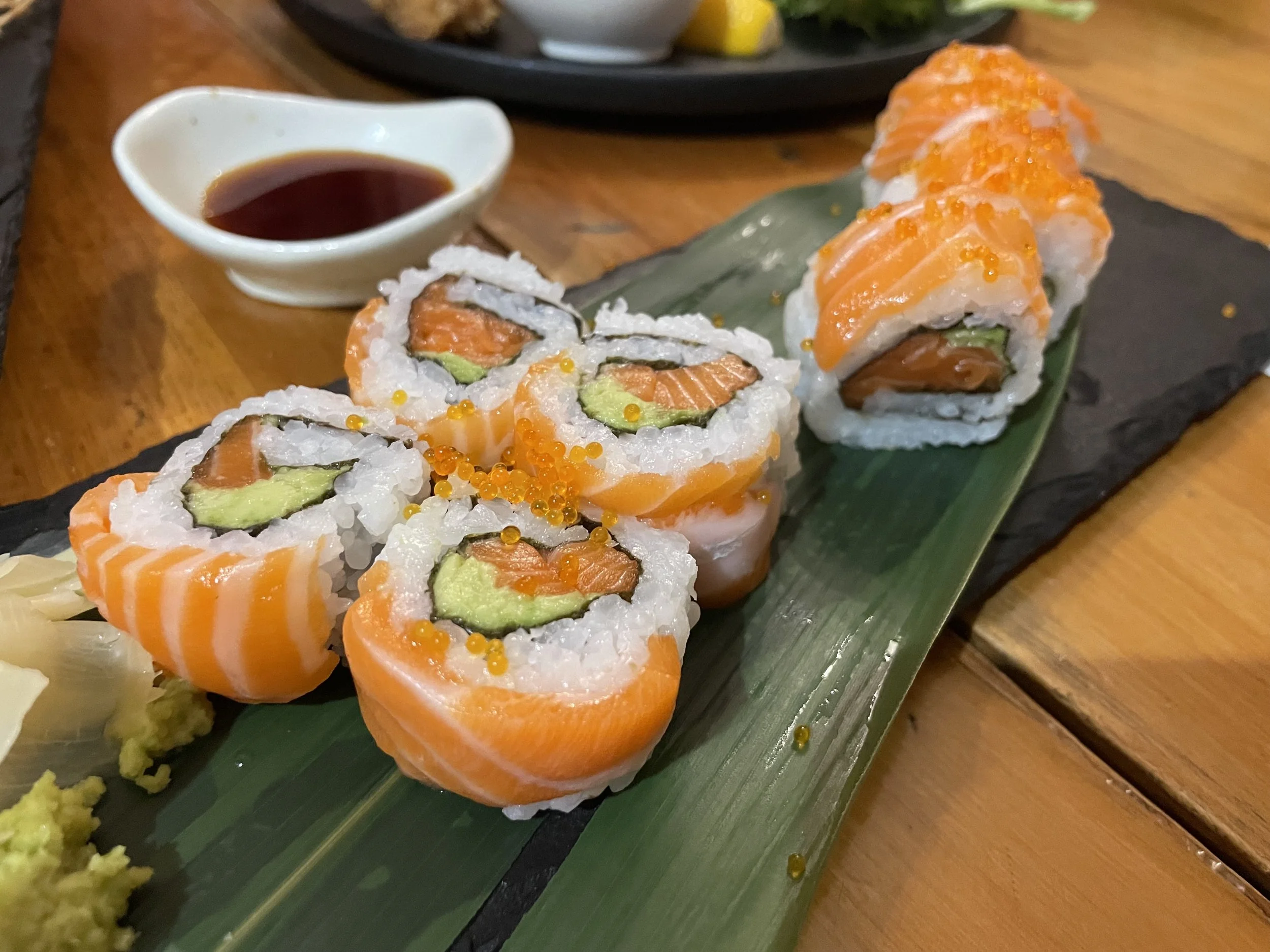 Those familiar with the term ‘aburi’ will know upfront that an aburi salmon sushi roll will be delicious and it was. Delicate raw salmon gets a light kiss from a blowtorch adding a hint of smokiness and colour but the salmon remained medium rare and juicy, topped with a sprinkle of tobiko (salmon roe). The large sashimi plate ($35 for 15 pieces) was very reasonably priced and had a good variety of fresh fish.