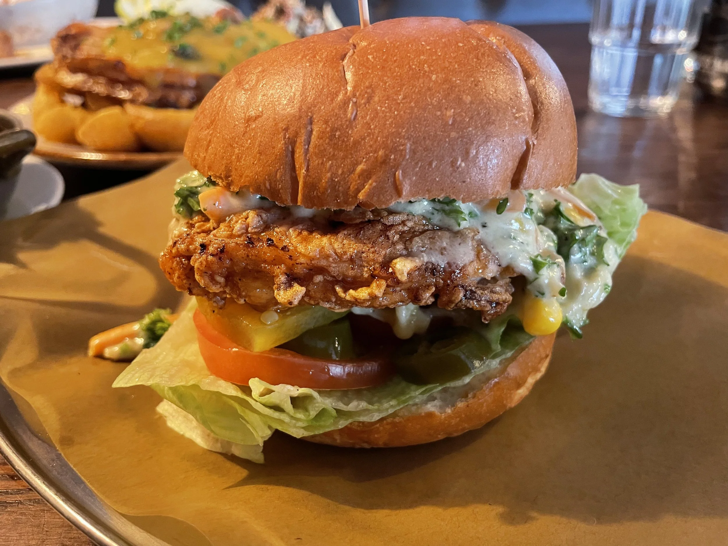 We next tried the Southern Dixie Burger, a towering stack of fried chicken served with oozing Dixie Chicken sauce, jalapeños, pickles, iceberg lettuce and tomato. I was unfamiliar with their Dixie Chicken dish from which this thick and creamy white sauce was drawn, so biting into this burger really had my tastebuds working overtime trying to figure out ‘what the heck am I eating?’ After a lot of humming and hah-ing I finally concluded the sauce tasted most like a garlicky, creamy chowder. The pickles and jalapeños add some tangy respite from the rich sauce and the southern-styled chicken itself was nice and juicy.