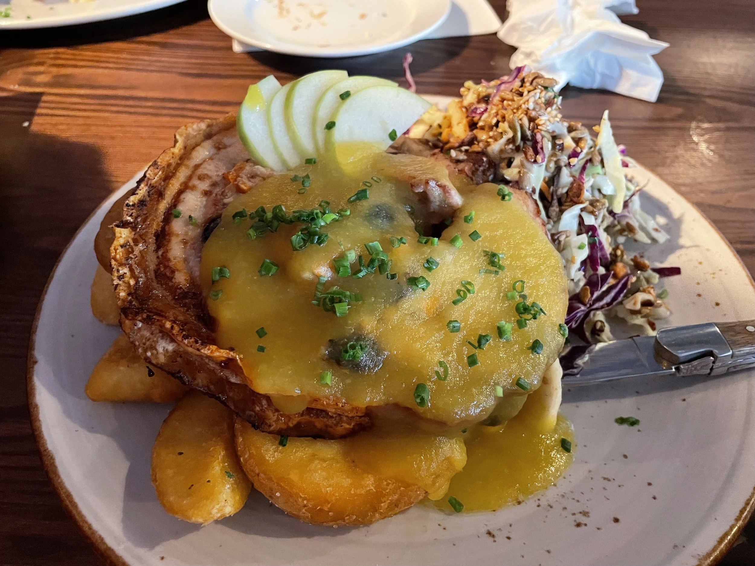 Fans of roast pork will go ga-ga over the Lassoo of Hog, a monstrously huge dish that could sufficiently feed two adults alone. 400g of beautifully seasoned and juicy rolled pork loin with perfectly crunchy crackling came wrapped around a prune, carrot and mustard seed stuffing with a fragrant apple and ginger sauce. It also comes with the iconic Lone Star coleslaw which I had forgotten about until I took my first bite and remembered who much I used to loved this stuff. It toes the line between creamy and refreshing perfectly and the slaw is stuffed with seeds and nuts adding an earthy element and crunch that has you coming back for more. The chunky buffalo chips were perfect: big, crunchy, fluffy, brilliant.